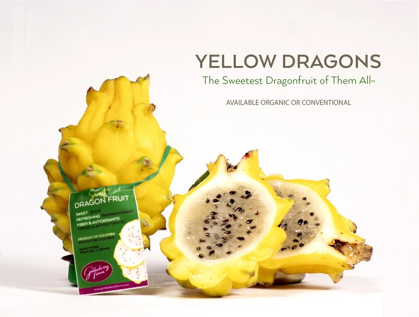 Goldenberry Farms® is at the forefront of this movement, offering red/white, red/red, and yellow dragonfruit, sold individually and in their popular clamshell (2 for 1) presentation. With conventional and organic varieties from farms in Ecuador and Colombia, Goldenberry Farms ensures full social and GAP certifications, delivering premium, ethical, and sustainable produce to your shelves.